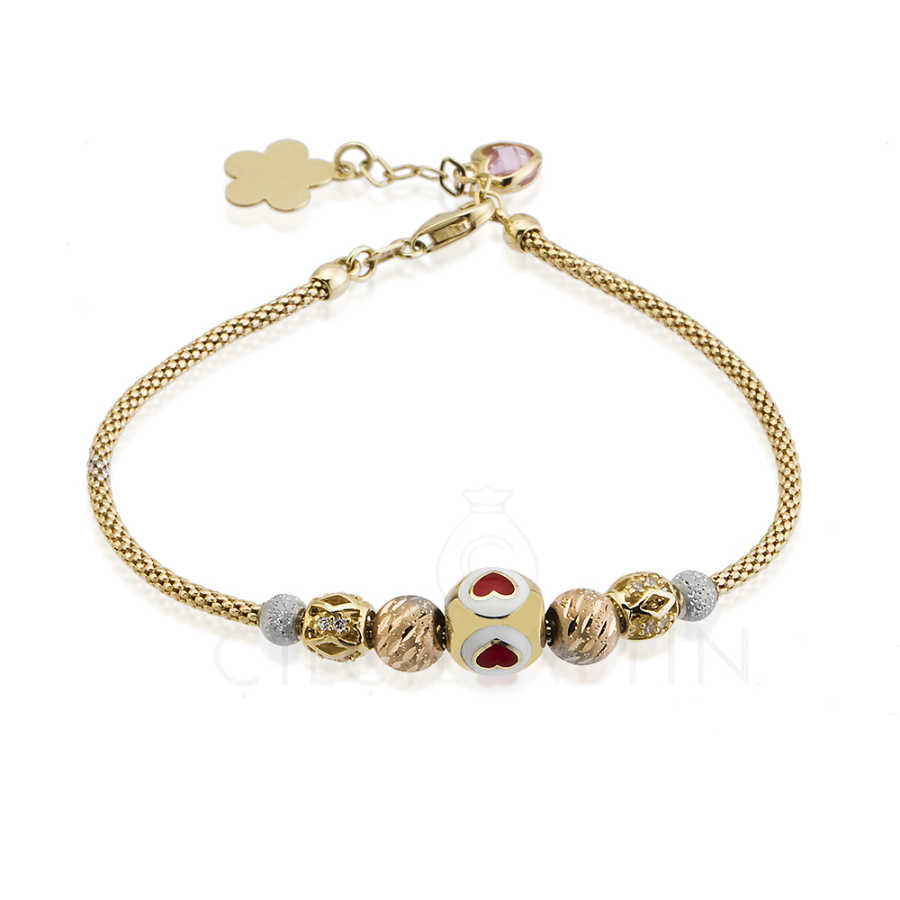 Boncuklu Kalpli Altın Bileklik hoş ve spor görünümü ile gençlerin ilgi odağında. Altın takıların gövdesi 14 ayar altından ve en kaliteli pırlanta ve atomlardan yapılmaktadır.